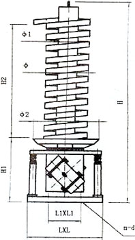 ZC系列垂直振動(dòng)輸送機(jī)的驅(qū)動(dòng)裝置振動(dòng)電機(jī)安裝在輸送塔下部,兩臺(tái)振動(dòng)電機(jī)對(duì)稱交叉安裝,輸送塔由管體和焊接在管體周圍的螺旋輸送槽組成,輸送塔座于減振裝置上,減振裝置由底座和隔振彈簧組成。(見圖一)當(dāng)垂直輸送機(jī)工作時(shí),根據(jù)雙振動(dòng)電機(jī)自同步原理,由振動(dòng)電機(jī)產(chǎn)生激振力,強(qiáng)迫整個(gè)輸送塔體作水平圓運(yùn)動(dòng)和向上垂直運(yùn)動(dòng)的空間復(fù)合振動(dòng),螺旋槽內(nèi)的物料則受輸送槽的作用,作勻速拋擲圓運(yùn)動(dòng),沿輸送槽體向上運(yùn)動(dòng),從而完成物料的向上(或向下)輸送作業(yè)。